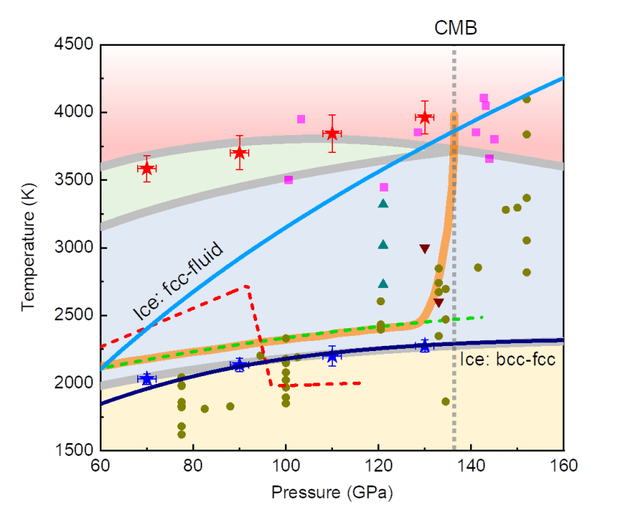 图1:AlOOH和H2O高温高压下(60-160 GPa与1500-4500 K)相图,超离子态转变增加了含水相的稳定性,使得AlOOH和H2O在下地幔(橙色为地温曲线)以超离子态形式存在。